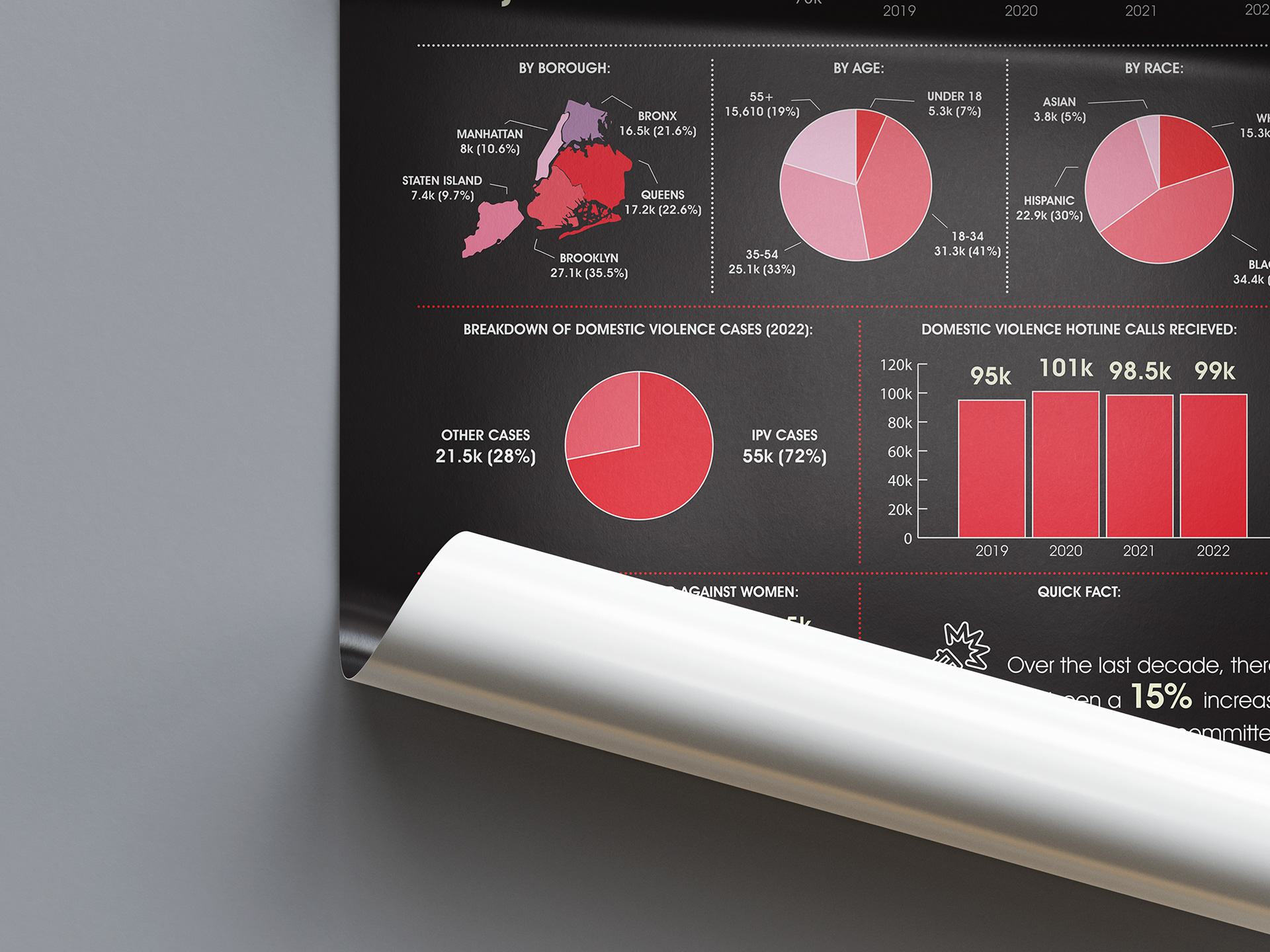 The Idea: WOMEN IN NYC is a data-driven poster series that visualizes key issues impacting women across New York City. These include health, unemployment, homelessness, crime, and suicide.